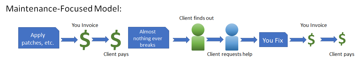 With this model, the client enjoys more uptime. You probably make about the same amount of money, but you get the money sooner and have fewer “emergencies” over the course of the month.